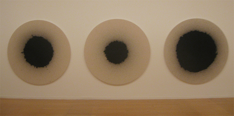 Più spiazzanti delle bombette piene d’inchiostro sono i quadri della serie Tamburo. Delle grandi tele tonde dal diametro di 173 cm su cui l’artista ha fatto cadere delle gocce d’inchiostro nero fino a formare delle circonferenze proporzionali alla durata dello sgocciolamento. Bianco/nero, colore/tela, materia/vuoto. Questi quadri ricordano degli occhi umani che ci guardano o dei buchi neri in cui i nostri occhi si perdono. Oppure, a quelli che si sono ripassati la lezione di storia dell’Arte, la tecnica del dripping con cui gli esponenti dell’Action Painting americana schizzavano e macchiavano le loro tele.