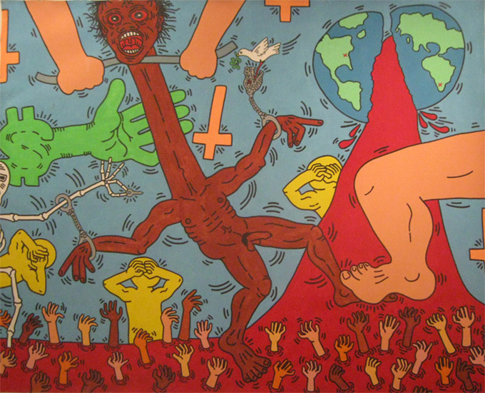 Michael Stewart – USA for Africa ha la particolarità di essere una delle poche opere del graffitista americano in cui il personaggio rappresentato non è un anonimo ma un individuo dal volto definito ed espressivo. Al povero Michael Stewart, ritratto come Dio l’ha fatto, viene tirato il collo come una gallina da delle forti braccia di un uomo bianco, mentre una mano verde (il colore dei dollari, c’è pure il simbolo) si protende minacciosa per stringerlo. Keith Haring tuttavia non si limita a commemorare la morte del giovane afroamericano. La sua opera si carica di rimandi simbolici per elevarsi a un livello superiore : dal particolare all’universale.