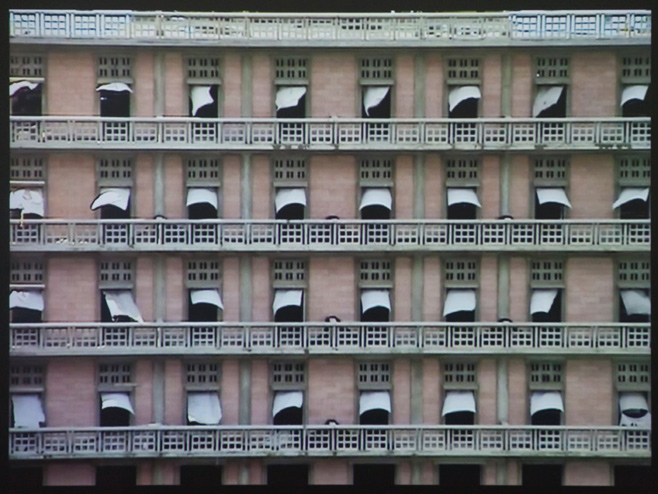 Nata a Izmir nel 1960, Hale Tenger si è formata al dipartimento di pittura della Sinan University, a Istanbul, prima di usufruire di una borsa di studi presso la South Glamorgan Institute of Higher Education di Cardiff. I suoi lavori, esposti in mostre di tutto il mondo, sono di solito delle complesse installazioni multimediali in cui viene messo in discussione il punto di vista dello spettatore in quanto semplice osservatore di situazioni al contempo universali e strettamente legate al contesto culturale/sociale/politico in cui si svolgono. Sono consapevole che detto così suona arzigogolato : ma purtroppo non sono in grado di esprimermi altrimenti. Beirut è un video della durata di soli 3’47”, se volete ne trovate un breve estratto su Youtube. A venire inquadrata, la facciata dell’hotel St. George di Beirut, luogo in prossimità del quale il 14 febbraio 2005 avvenne un grave attentato con un’autobomba. Booooom : 21 morti in un sol colpo. Peggio della strage di Capaci. Tra le vittime, l’ex Primo Ministro libanese Rafīq al-Ḥarīrī e l’ex Ministro dell’Economia Bassel Fleihan. Il video, girato segretamente in un’area sotto il controllo armato delle Nazioni Unite, è diviso in due parti. Il prima e il dopo. Il giorno e la notte. Nella prima parte, la luce pallida del sole si riflette sull’edificio, e le tende bianche dell’hotel sventolano chiare fuori dalle finestre, cullate dall’ipnotica musica di Serdar Ateşer. La calma prima della tempesta. Nella seconda, invece, ripresa notturna sulle tonalità cromatiche verdi, si capisce che la tragedia è avvenuta, lo scoppio ha sconquassato l’instabile tranquillità. Esplosioni, sirene, spari. Le truppe nemiche sono intervenute. La guerra è arrivata in città. E le tende sbattono sui balconi. Disperate. Come immaginari personaggi che urlano il proprio dolore. Ora chiudiamo un attimo gli occhi e facciamo un bel respiro. Torniamo alla realtà. Beirut, per quanto impressionante e verosimile possa apparire, non è un video documentario ma un’opera di finzione. Hale Tenger, infatti, non ha registrato la sequenza notturna nel pieno di un conflitto, ma ha ricreato l’atmosfera della guerra in Medio Oriente aggiungendo alle immagini i suoni dell’intervento armato israeliano in Libano del 2007. Siamo di nuovo lì : nemmeno una goccia. Per immaginare il sangue versato nei combattimenti bastano gli effetti sonori. E i balconi vuoti di un edificio, spalti ideali da cui contemplare lo spettacolo della violenza.