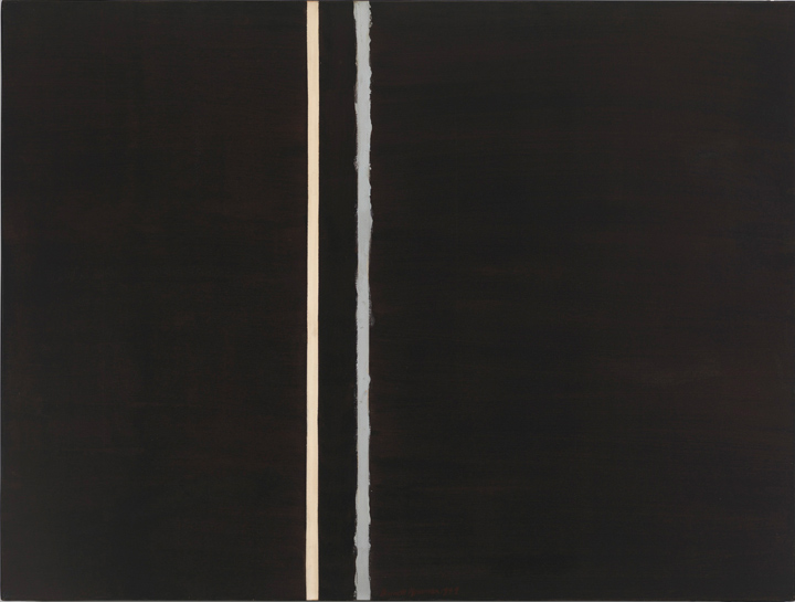 Alla mostra di Palazzo Reale non sono esposte opere solamente di Jackson Pollock, ma anche di altri Irascibili e di loro precursori. Rigoroso nell’astrazione addirittura più di Pollock è il compatriota Barnett Newman, che non ha bisogno di trasferirsi a New York dato che già ci nasce, nel 1905. Davanti alla sua grande tela La Promessa pare di guardare lo schermo guasto di un vecchio televisore a tubo catodico, uno di quegli elettrodomestici che si riparavano a pugni e insulti. Un fondo nero interrotto da due sottili strisce verticali leggermente sbavate, una grigia e una di color sabbia. A Newman piace chiamarle “zip”, cerniere, come quelle dei pantaloni. Il pittore le realizza in due maniere : dipingendole semplicemente in rilievo rispetto al fondo colorato, oppure applicando una fascia di carta alla tela e sfregandovi del colore, lasciando che questo sbordi e crei l’effetto sbavato. Tolta la fascia, ecco ottenuta una striscia in negativo. Vi pare un po’ asettico ? Eh già, in Barnett Newman la danza eccitata dell’amico Pollock lascia spazio all’austerità. Quando si dipinge, si dipinge. Mica si balla. Dioniso cede il posto a Cartesio.