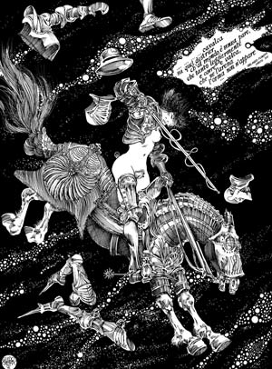 A ogni modo, dicevamo prima di perderci nell’estasi che provocano i nobili versi dell’Ariosto… sì, l’Orlando Furioso e gli artisti contemporanei. La mostra di Reggio Emilia, intitolata L’Orlando Furioso : Incantamenti, Passioni e Follie, L’arte contemporanea legge l’Ariosto, è una vera chicca per tutti gli appassionati del poema cavalleresco ma anche per il pubblico profano. Più di 50 artisti contemporanei rendono encomio (l’occasione si presta a utilizzare un termine aulico) al monumento poetico ariostesco, e soprattutto mettono in luce la sua inesauribile capacità di muovere l’immaginario in campi artistici differenti quali la pittura, l’illustrazione, la scultura, il fumetto e persino la fotografia.