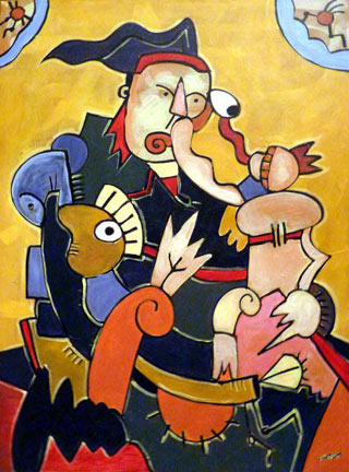 Bello, il mondo di Antoh. Non vi piacerebbe viverci ? E dire che spesso è frutto di distratti scarabocchi su carta inventati durante noiose telefonate in ufficio. Da un confuso ghirigoro a penna, sviluppato poi su tela con colori a olio, può nascere un irriconoscibile ritratto del principe Myskin, lo sfortunatissimo protagonista de L’idiota di Dostoevskij, oppure la rivisitazione in chiave pop di un capolavoro dell’arte rinascimentale. Quando è la libera immaginazione a farla da padrone, non ci sono procedure burocratiche o regole aziendali che tengano : nel mondo di Antoh tutto è possibile, anche riscrivere i libri, riscrivere persino il libro dei libri, fantasticare scenari alternativi della Bibbia.