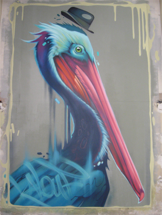 A sorprendermi, tuttavia, dinosauri a parte, era un imponente murales posto appena dopo l’ingresso, un’immagine uscita da qualche fumetto demenziale o cartone animato grottesco per adulti. Sfrigolante di colori e impreziosito da un effetto di trompe-l’œil che lo metteva in rilievo rispetto alla parete, raffigurava un topo totalmente fuori di testa intento a picchiare al terreno una moneta d’oro e con attaccato al dorso, a mo’ di zaino, un dentone umano che gli sbriciola la coda. Mi sarebbe davvero piaciuto sapere che cosa ha ispirato questa figura assurda, quale sogno o quale incubo ne sono all’origine, peccato solamente che il suo autore, l’artista graffitaro Stom 500, non fosse presente al vernissage e pertanto la mia curiosità sia rimasta insoddisfatta.