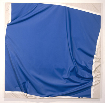 Così, infiammato da mania decostruttiva, Parrino concepiva un quadro fuori quadro, un quadro scentrato, Turning Blue appunto. A guardarlo anche con occhio distratto, si capisce presto il trucco che vi sta dietro : l’artista aveva colorato una tela tutta di blu, l’aveva staccata dal telaio, l’aveva un poco spiegazzata, e l’aveva infine rimessa al suo posto leggermente sbilenca e sbavata. L’effetto creato non è certo sorprendente, ricorda forse certe illusioni ottiche da baraccone o trovate sceniche. Qui però il gioco sta altrove, il gioco nasce dal rapporto ambiguo che il monocromo instaura con il proprio titolo. Turning Blue, infatti, in inglese può avere due significati, in questo caso entrambi calzanti. “Turn” significa prima di tutto “svolta” o “rotazione”, e nella sua forma verbale “girare” : questo è il blu che gira, dice allora l’artista, questo è il colore in movimento, questa è la pittura che supera i propri limiti dimensionali. Ma nella sua variante figurata, “turn” significa anche “diventare” : Diventando Blu suona quindi il titolo italiano del dipinto, echeggiando di lontano le famose strofe di Domenico Modugno. Forse era da lì, da quella strana assonanza, che il flebilissimo tic m’era entrato nell’orecchio ?