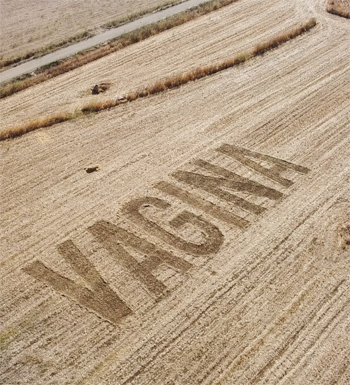 La parola così composta, designante in più di cinquanta lingue al mondo l’organo copulatore femminile, nelle intenzioni dell’artista vuole lanciare un messaggio di rottura, produrre dibattito, infrangere un tabù. VAGINA : sì, avete letto bene, c’è scritto proprio questo, questo salta subito all’occhio, a splendere in direzione del cielo è proprio questa parola. Troppo tempo, infatti, essa è stata oggetto d’imbarazzo, scherno, sproloquio ; troppo tempo, insomma, la gente ha tentato d’evitarla ricorrendo a sinonimi, vezzeggiativi e una moltitudine d’espressioni immaginifiche che lascerò ai miei lettori più eruditi il compito d’elencare. Ora è quindi il momento di dire pane al pane e vino al vino, deve aver pensato AMADAMA, ora è il momento di scoperchiare il vaso di Pandora, e arando un terreno agricolo fiaccato dalla siccità estiva ha inciso VAGINA sul suolo sardo.