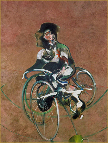 Pochi mesi, pochi gesti, tanti indizi. Il pittore non ci mise molto per rendersi conto dell’estrema vulnerabilità del giovane amante, duro dal cuore fragile. Perché dietro le giacche eleganti e gli occhiali da sole, dietro l’aria vagamente spavalda da farabutto d’alto bordo, George Dyer celava un animo docile, solitario, incline talvolta alla malinconia. Nulla a che fare con gli stereotipi dei gangster spietati che si leggevano in libri e giornali – e sui quali l’artista ricamava le fantasie più spinte. Questa curiosa dualità fu per Bacon l’origine d’una profonda affezione, nonché una grandissima fonte d’ispirazione artistica. George Dyer seduto, George Dyer in piedi, George Dyer svestito, George Dyer in bicicletta… lo ritraeva in tutte le pose, in tutti gli umori, oltre quaranta dipinti in suo onore, quasi che la tela fosse uno spazio dove sublimare il loro tumultuoso rapporto amoroso. Nella vita reale, infatti, il carattere incostante e dispotico del pittore prese presto il sopravvento.